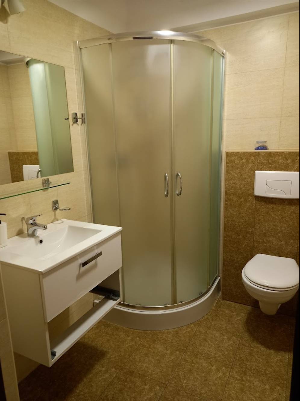 kúpeľňou so sprchou, chladničkou, a rýchlovarnou kanvicou. Okrem